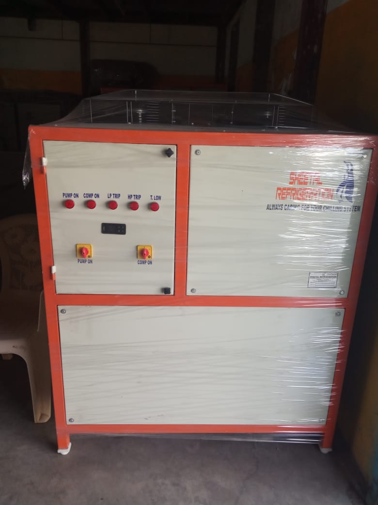 Brand: SHEETAL Model Name/Number: Sheetal Compressor Type: Reciprocating Type: Air Cooled Tonnage: 5TR Phase : 3 phase Material: MS powder Coated Body Automation Grade: Automatic Voltage: 440V Color: Orange Features: Fully Automatic Chiller Shape: Box Tpe Evaporator: PHE No. Of Compressor: 1 Refrigerant Used: R22 / R 407 Tank Capacity: As per requirement Temperature Range: 10-15 Warranty: 1 Year